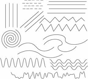 4. เส้นหยัก หรือ เส้นซิกแซก แบบฟันปลา ให้ความรู้สึก คลื่อนไหว อย่างเป็นจังหวะ มีระเบียบ ไม่ราบเรียบ น่ากลัว อันตราย ขัดแย้ง ความรุนแรง
