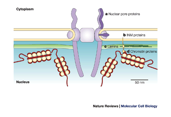 1. เยื่อหุ้มนิวเคลียส ( Nulear membrane) เป็นเยื่อบางๆ 2 ชั้น เรียงซ้อนกัน ที่เยื่อนี้จะมีรู เรียกว่านิวเคลียร์พอร์ ( Nuclear pore) หรือ แอนนูลัส ( Annulus) มากมาย รูเหล่านี้ ทำหน้าที่เป็นทางผ่านของสารต่าง ๆ ระหว่างไซโทพลาสซึมและนิวเคลียส นอกจากนี้เยื่อหุ้มนิวเคลียส ยังมีลักษณะเป็นเยื่อเลือกผ่าน เช่นเดียวกับเยื่อหุ้มเซลล์ เยื่อหุ้มนิวเคลียสชั้นนอก จะติดต่อกับเอนโดพลาสมิกเรติคูลัม และมีไรโบโซมมาเกาะ เพื่อทำหน้าที่ลำเลียงสารต่าง ๆ ระหว่างนิวเคลียสและไซโทพลาซึมด้วย