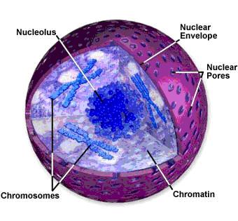 2. โครมาทิน (Chromatin) เป็นส่วนของนิวเคลียส ที่ย้อมติดสี เป็นเส้นในเล็กๆ พันกันเป็นร่างแห เรียกร่างแหโครมาทิน ( Chromatin network) โดยประกอบด้วย โปรตีน รวมกับกรดดีออกซีไรโบนิคลีอิค ( deoxyribonucleic acid) หรือเรียกว่า DNA เป็นสารพันธุกรรม ที่ควบคุมลักษณะของสิ่งมีชีวิต