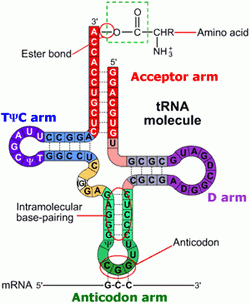 tRNA ตัวมันจะมีกรดอะมิโนมาเกาะอยู่ ทำหน้าที่นำกรดอะมิโนมาเรียงร้อยต่อกันเป็นโปรตีน ชนิดของกรดอะมิโนที่จะนำมาต่อนี้ถูกกำหนดโดยรหัสพันธุกรรมบน mRNA ส่วน tRNA มีตัวช่วยอ่านรหัสเรียกว่า anticodon