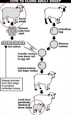 ไซต์ตัวรับ (Oocyte recipient preparation) ข. เตรียมนิวเคลียสจากตัวอ่อน ต้นแบบ (nuclear donor preparation) ค. ดูดเอานิวเคลียสตัวอ่อนให้ใส่ไปยัง ไซโตพลาสซึ่มของโอโอไซต์ (nuclear transfer)เชื่อม นิวเคลียสให้ติดกับไซโตพลาสซึ่มของโอโอไซต์ (oocyte-nuclear fusion) การเลี้ยงนำตัวอ่อน (embryo culture) และ ฉ. การย้ายฝากตัวอ่อน (embryo transfer