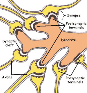 ของเซลล์ประสาทหนึ่งไปยังเดนไดรต์ของเซลล์ประสาทหนึ่งอีกเซลล์หนึ่งผ่านช่องแคบ ๆ ที่เรียกว่า ไซแนปส์ (Synapse)