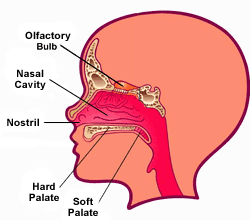 รีเซปเตอร์ที่จมูกจะรับรู้เกี่ยวกับสารเคมี โดยตรงบริเวณเยื่อบุผิวภายในช่องจมูก (olfactory epithelium) จะประกอบด้วยเซลล์ 3 ชนิด คือ เซลล์รับกลิ่น (olfactory receptor cells) ซึ่ง เป็นเซลล์ประสาทสองขั้วเซลล์ซัสเทนตะคูลาร์ (sustentacular cells หรือ supporting cell) ทำหน้าที่สร้างเมือกร่วมกับต่อมภายในโพรงจมูก (olfactory glands) เพื่อทำให้เกิดความชุ่มชื้นและเป็นตัวทำละลายสารเคมีที่ผ่านเข้ามาซึ่งทำให้เกิดกลิ่นและมีเซลล์ ขนาดเล็กเรียกว่าเซลล์เบซอล (basal cells) ทำหน้าที่แบ่งเซลล์ ให้กำเนิด เซลล์รับกลิ่นและเซลล์ซัสเทนตะคูลารทดแทนเซลล์เดิมที่ตายไป บริเวณส่วนปลาย ของเซลล์รับกลิ่น จะมีขนยื่นเข้าไปในชั้นเมือกที่เคลือบอยู่ในช่องจมูกและมี แอกซอน ของเซลล์รับกลิ่น (เป็นเซลล์ประสาทที่ไม่มีเยื่อหุ้มไมอีลิน) จะผ่านไปที่ เบซัล ลามินา (basal lamina)และรวมกลุ่มกันเป็นเส้นประสาทสมองคู่ที่ 1 (olfactory nerve) ผ่านทะลุไปในชั้นคริบริฟอมเพลตของกระดูกเอทมอยด์ (cribriform plate of ethmoid bone) ไปที่โอลแฟกทอรีบัลบ์ (olfactory bulb) และโอลแฟกทอรีแทกซ์ (olfactory tract) ไปสู่ โอลแฟกทอรีคอร์เทกซ์(olfactory cortex) ซึ่งอยู่ในส่วนเทมพอรัลโลป (temperal lobe) ของสมองใหญ่