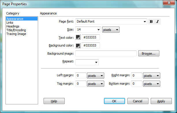 ก่อนเริ่มกำหนดรายละเอียดต่างๆ ให้หน้าเว็บ เราควรเริ่มโดยการกำหนดรายละเอียดของหน้าเว็บเพจเบื้องต้น โดยสามารถเข้าไป "กำหนดรายละเอียดของเว็บเพจ" ได้ที่ Modify > Page properties