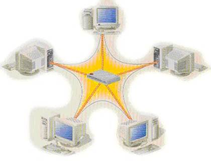 เป็นการเชื่อมต่อสายสื่อสารแบบจุดต่อจุด โดยสถานีทุกสถานีในเครือข่ายจะต่อเข้ากับหน่วยสลับสายกลาง (WIRING CONCENTRATOR หรือ HUB) แบบจุดต่อจุด การติดต่อสื่อสารระหว่างสถานีจะกระทำได้ด้วยการติดต่อผ่านทางวงจรของหน่วยสลับสายกลาง การทำงานของหน่วยสลับสายกลางจึงคล้ายกับศูนย์กลางของการต่อวงจรเชื่อมโยงระหว่างสถานีต่างๆ ที่ต้องการติดต่อกัน สถานีแต่ละสถานีจะมายต่อเข้าศูนย์บริการข้อมูล ไม่มีการใช้สายส่งข้อมูลร่วมกัน ดังนั้น ถ้าสายส่งข้อมูลหรือการ์ดการเชื่อมโยงเครือข่ายของสถานีใดเสียหาย ก็จะมีผลเฉพาะสถานีนั้นเท่านั้น ไม่มีผลต่อสถานีอื่น