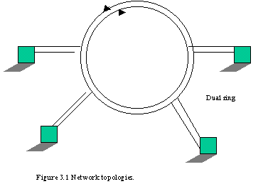 2.แบบ DUAL RING : มีใช้ในระบบ FDDI โดยที่ RING ทั้งสอง สามารถทำงานร่วมกันได้ หากมี RING ใด RING หนึ่ง FAIL ก็ยังสามารถทำงานต่อไปได้