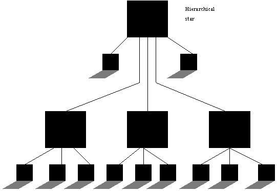 6.แบบ HIERACHICAL STAR : เป็นลักษณะการเชื่อมต่อแบบ HUB ซ้อน HUB ในระบบ LAN