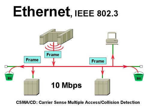 ลักษณะสำคัญแต่เดิมของ Ethernet คือข้อมูลทุกอย่างจะส่งผ่านตัวกลางหรือ Ether ที่เชื่อมระหว่างทุกๆ node ซึ่งในที่นี้ก็คือสาย Coaxial นั่นเอง ดังนั้น Ethernet ในยุคแรกจึงใช้การต่อสายแบบ Bus ที่วิ่งผ่านทุกเครื่อง และต่อมาค่อยๆ เปลี่ยนไปสู่การต่อแบบ Star ที่รวมสายเข้าศูนย์กลางเมื่อมีการใช้สาย UTP ที่ต่อผ่านอุปกรณ์ HUB เกิดขึ้น มาตรฐานของระบบ Ethernet เป็นไปตามมาตรฐานที่ชื่อ IEEE 802.3 ซึ่งในในการต่อสายแบบที่เชื่อมทุกเครื่องถึงกันโดยตรง โดยมีกฎเกณฑ์หรือโปรโตคอลแบบ CSMA/CD ซึ่งชื่อมาตรฐานของ Ethernet นั้นจะแยกแยะได้ด้วยรหัสดังตัวอย่างต่อไปนี้