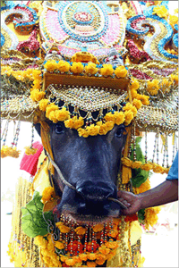 อย่างงดงามด้วยผ้าแพรพรรณดอกไม้หลากสี ตัวเจ้าของควายก็แต่ง