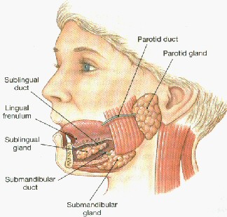1. ต่อมน้ำลายใต้ลิ้น 2. ต่อมน้ำลายใต้ขากรรไกรล่าง 3. ต่อมน้ำลายข้างกกหู มีท่อนำสารออก เรียกว่าท่อ สเตนสัน(Stenson's duct) ถ้าหากมีเชื้อไวรัสเข้าไปที่ต่อมนี้ จะทำให้เกิดโรคคางทูม (mump) น้ำลาย(Saliva) มีฤทธิ์เป็นกรดอ่อน มีปริมาณแคลเซียม สูงมาก ทำหน้าที่ละลายอาหาร ป้องกันไม่ให้ปากแห้ง และ ช่วยในการเคลื่อนไหวของลิ้นขณะพูด ศูนย์ควบคุมการ หลั่งน้ำลาย คือสมองส่วนที่อยู่ระหว่าง medulla obongata และ pons