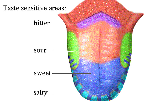อยู่บริเวณปลายลิ้นและข้างลิ้น รสเปรี้ยว อยู่บริเวณข้างลิ้น รสขม