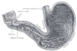 หน้าที่หลักของกระเพาะอาหารคือการย่อยสลายสารอาหารโมเลกุลใหญ่ให้เล็กลงโดยอาศัยการทำงานของกรดเกลือ (hydrochloric acid) เพื่อให้ง่ายต่อการดูดซึมที่ลำไส้เล็ก นอกจากนี้กระเพาะอาหารยังมีหน้าที่ผลิตเอนไซม์ที่ใช้ในการย่อยโปรตีน คือเอนไซม์เพพซิน (pepsin) โดยในช่วงแรก เอนไซม์นี้จะถูกผลิตออกมาในรูปของเพพซิโนเจน (pepsinogen) ที่ยังไม่สามารถทำงานได้ แต่จะถูกเปลี่ยนเป็นเพพซินเมื่ออยู่ในสภาวะที่เป็นกรดภายในกระเพาะอาหาร นอกจากนี้แล้ว กระเพาะอาหารยังทำหน้าที่ในการดูดซึมน้ำ ไอออนต่างๆ รวมทั้งแอลกอฮอลล์ แอสไพริน และคาเฟอีนอีกด้วย อย่างไรก็ตาม หน้าที่ของกระเพาะอาหารที่จำเป็นต่อการดำรงชีวิตคือการผลิตสารที่เรียกว่า อินทรินซิค แฟคเตอร์ (intrinsic factor) ซึ่งเป็นสารที่จำเป็นในการดูดซึมไวตามิน บี12