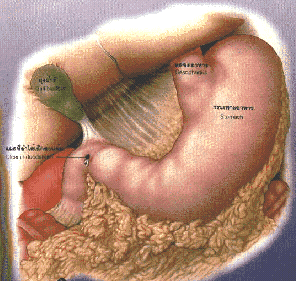 กระเพาะอาหารจะถูกแบ่งออกเป็นสี่ส่วน ซึ่งจะมีโครงสร้างในระดับเนื้อเยื่อที่แตกต่างกัน ได้แก่ส่วนบนสุด ปากกระเพาะ หรือส่วนคาดิแอค (cardiac) เป็นส่วนที่ติดต่อกับหลอดอาหาร