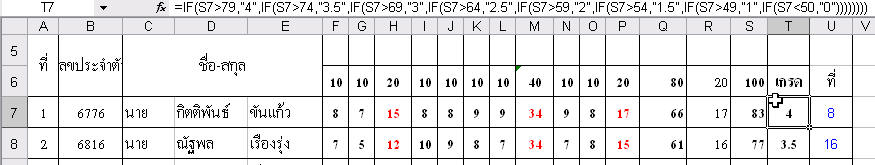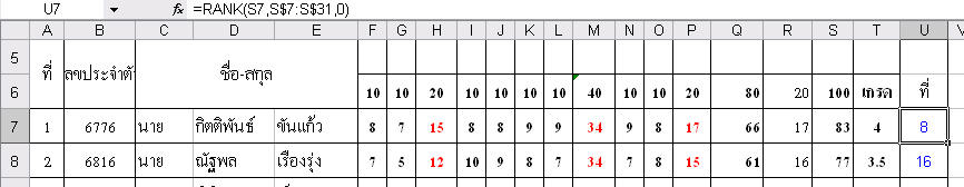 ฟังก์ชันหมายถึงสูตรพิเศษที่โปรแกรมสร้างไว้เพื่อให้คำนวณค่าต่าง ๆ ตามจุดประสงค์ การใช้ฟังก์ชัน จะช่วยให้เขียนสูตรในการคำนวณได้สั้นและง่ายขึ้น ตัวอย่างเช่น หากต้องการรวมค่าจากเซลล์ A1 ถึง A5 แทนที่จะพิมพสูตร =A1+A2+A3+A4+A5 ก็ใช้ฟังก์ชัน =SUM(A1:A5)แทนได้ ฟัง์ชันที่ควรรู้จัก =AVERAGE(D5:D20) หมายถึง ค่าเฉลี่ยของค่าที่อยู่ในช่วงเซลล์ D6ถึงD20 =MAX(D6:D20) หมายถึง ค่าสูงสุดของค่าที่อยู่ในช่วงเซลล์ D6ถึงD20 =MIN (D6:D20) หมายถึง ค่าต่ำสุดของค่าที่อยู่ในช่วงเซลล์D6ถึงD20 =STDEVP (D6:D20) หมายถึง ค่าเบี่ยงเบนมาตรฐานของคาในช่วงเซลล์ D6ถึงD20 =COUNTIF(ช่วงเขตข้อมูล,ค่าที่ต้องการนับ) เช่น =COUNTIF($J$6:$J$20,4) หมายถึง ช่วง J6ถึงJ20 มีเลข ภ กี่เซลล์ (ให้ค่าเป็นจำนวนนับ) =RANK(I6,I$6:I$20,0) หมายถึง ค่าลำดับของตัวเลขในเซลล์ I6 ที่อยู่ในรายการตัวเลขในช่วงเซลล์ I6 ถึง I20 ส่วนตัวเลขศูนย์เป็นการระบุวิธีการจัดเรียงรายการตัวเลขในช่วงที่กำหนดจากมากไปหาน้อย(ถ้าเป็นค่าอื่นที่ไม่ใช่ศูนย์จะเป็นการจัดเรียงรายการ =IF(เงื่อนไข,ค่าที่แสดงเมื่อเงื่อนไขจริง,ค่าที่แสดงเมื่อเงื่อนไขเท็จ)