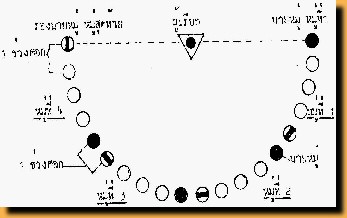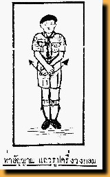 ท่าสัณญาน ผู้เรียกอยู่ในท่าตรง แบมือทั้งสองข้างเหยียดตรงลงข้างล่างคว่ำฝ่ามือเข้าหาตัว โบกผ่านลำตัว ประสานกันด้านหน้าช้า ๆ เป็นรูปครึ่งวงกลม ประโยชน์ ใช้ประชุมกองหน้าเสาธง ใช้ในพิธีเข้าประจำกองลูกเสือ การเข้าแถว ให้ลูกเสือกมู่แรกเข้าแถวด้านซ้ายมือของผู้เรียก โดยนายกมู่ของหมู่แรกยืนอยู่แนวเดียวกับผู้เรียก หมู่ที่สองและหมู่ต่อ ๆไปอยู่ทางด้านซ้ายมืองของหมู่แรกตามลำดับ จนคนสุดท้ายของหมู่สุดท้าย จะอยู่เป็นเส้นตรงแนวเดียวกับผู้เรียกและนายหมู่หมู่แรก โดยถือผู้เรียกเป็นจุดศูนย์กลาง ในกรณีที่มีหลาย ๆหมู่เช่น มี 5 หมู่ หมู่ที่ 3 จะเข้าแถวตรงหน้ากับผู้เรียก ถ้ามี 4 หมู่ คนสุดท้ายของหมู่ที่ 2 กับนายหมู่ที่ 3 จะอยู่ตรงหน้าผู้เรียก การจัดแถว ให้ลูกเสือทุกคน(ยกเว้นคนสุดท้ายของหมู่สุดท้าย)ยกมือซ้ายขึ้นเท้าสะโพก โดยให้ฝ่ามือพักอยู่ บนสะโพก นิ้วทั้งห้าเหยียดชิดติดกันชี้ลงพื้นอยู่ประมาณแนวตะเข็บกางเกง ศอกอยู่เสมอแนวลำตัว สะบัดหน้าไปทางขวา (ยกเว้นนายหมู่ หมู่ที่ 1 ) ระยะเคียงระหว่างลูกเสือในหมู่ 1 ช่วงศอก ระยะเคียงระหว่างหมู่ 1 ช่วงศอก ยกเว้นถ้าเข้าแถวรูปครึ่งวงกลมในการประชุมกองลูกเสือ หรือหน้าเสาธง จะต้องเว้นระยะระหว่างหมู่ไว้ 1 ช่วงแขน เพื่อสะดวกในการตรวจ การตรวจแถว เมื่อตรวจจัดแถว ผู้เรียกจะสั่ง "นิ่ง"ลูกเสือทุกคนลดมือซ้ายลงพร้อมกับสะบัดหน้า กลับมาอยู่ในท่าตรง |
