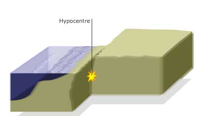 หรือจุดไฮโปเซ็นเตอร์ (hypocenter) ซึ่งเป็นจุดที่คาดว่าเกิดการเบียดของ 2 รอยต่อ